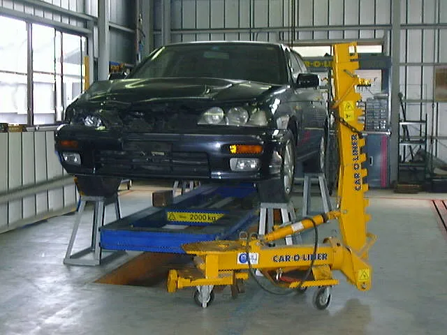 車の大きな損傷の場合は、内部の車両骨格まで歪んでしまいます。歪んだ車両骨格を、ミリ単位で修正していく為には、こちらのフレーム修正機が必要となります。
