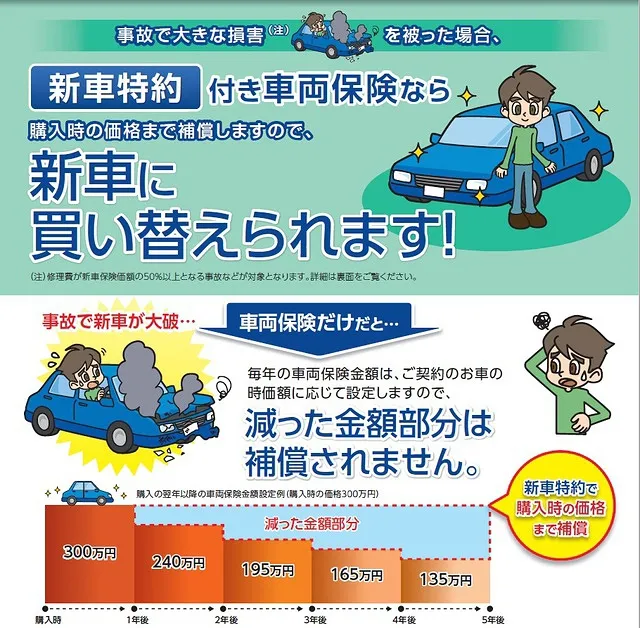 ※一部新車特約を付けられる保険会社もあるが、新車保険の保険金の受け取り先はリース会社となっているので、リース契約の内容は要確認。