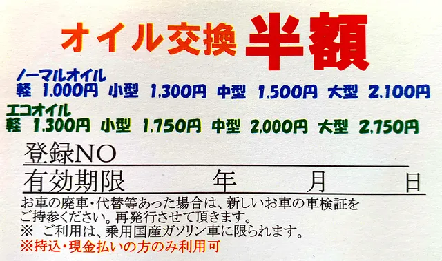 うれしい特典として次回車検まで何度でも使えるエンジンオイルの半額券が付いてきます。