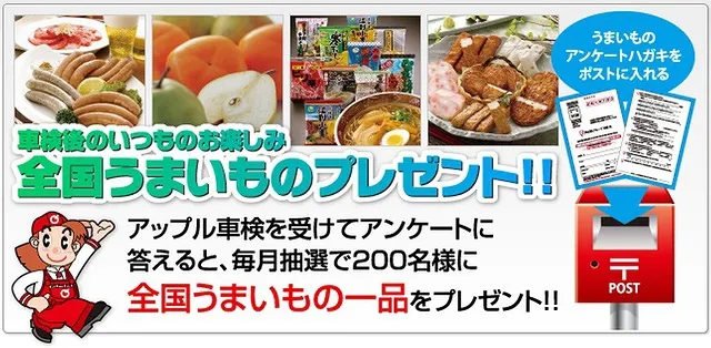 車検後に貰えるWEBデジタルアンケート応募すると抽選で200名様に全国の美味しい名産が選べるギフトカタログをプレゼント!