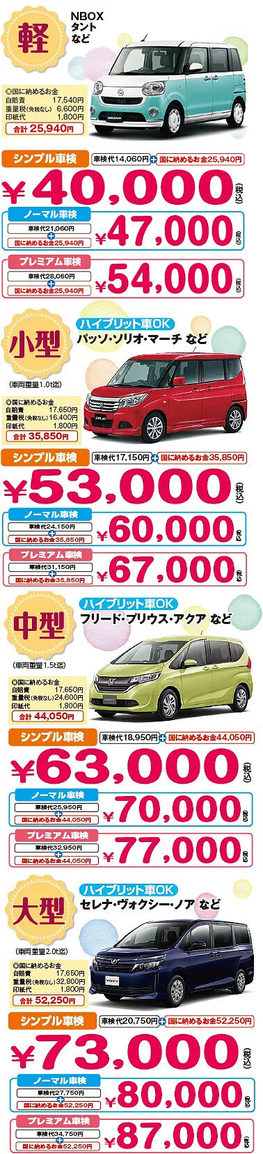 ※改造車両等、車検に合格出来ない場合、別途点検・整備費用が追加されます。