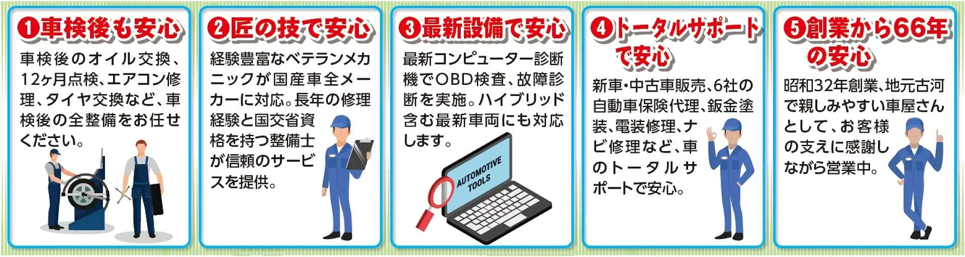 昭和32年創業、地元古河で親しみやすい車屋さんとして、お客様の支えに感謝しながら営業中。