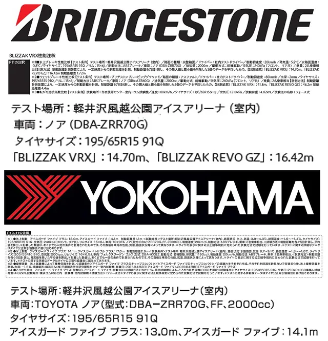 この疑問にも、カタログを読み込むと195/65R15の同じタイヤサイズで両メーカーがテストしています。