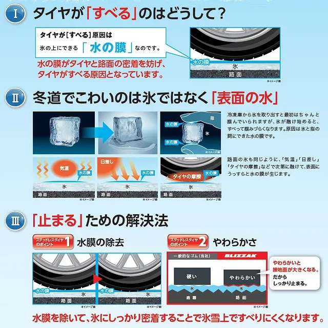 上記のⅢで説明しているように、スタッドレスタイヤは氷表面の水膜を除去し、その柔軟性で路面にグリップして止まります。