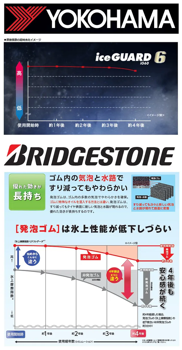 当社がヨコハマタイヤやブリジストンタイヤのスタッドレスタイヤを薦めるのは、この2メーカーは経年劣化が非常に少ないという事がポイントです。