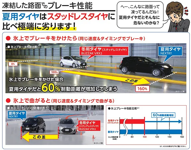 写真は、ノーマルタイヤとスタッドレスタイヤの氷上でのブレーキ性能の比較になりますが、